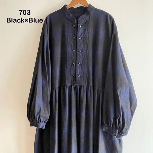 たっぷり分量でウエスト切替に一周ギャザーを施し、袖口もパフになっていてふんわりと素材のなめらかさを最大限に生かしたフォルムの暖かみあるフランネルチェックのドレスです。