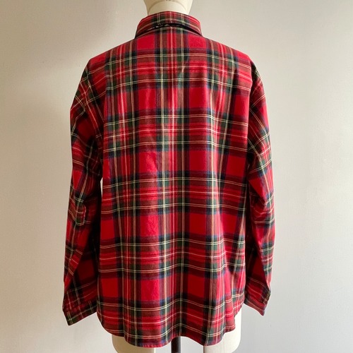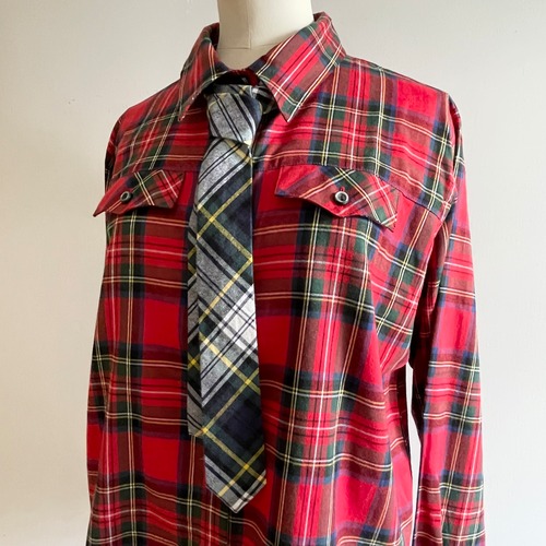 赤のタータンチェックのシャツにネイビーチェックのネクタイを組み合わせたボーイスカウトシャツ。サラウェア永遠のテーマでもあるキュートでマスキュランなアイテムです。胸ポケットは飾りです。