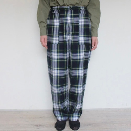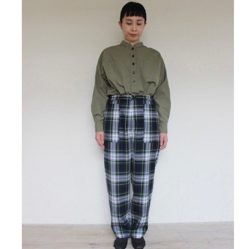 腰回りにゆとりを持たせて裾に向かって細く、脚長にきれいに見せてくれるゆるやかなテーパードパンツです。ウエスト後ろ側はゴム仕様で、前内側の紐で絞ることができます。