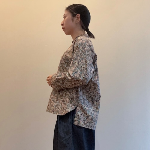 パープルがベースの小花柄リバティプリントのポッターシャツ。すっきりとしたスタンドカラーの凛とした佇まいから陶芸家をイメージして名付けられました。胸元のループボタンや前後で異なる裾のカットがアーティスティックな雰囲気です。