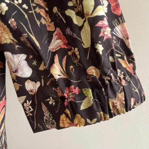 ブラックがベースのシックなボタニカル柄リバティプリントのプチカラーシャツです。名前の通り小さな襟が特徴のゆったりした身幅と袖のデザインで、袖口外側にゴムが通っていることによりフワッとギャザーがアクセントにになっています。