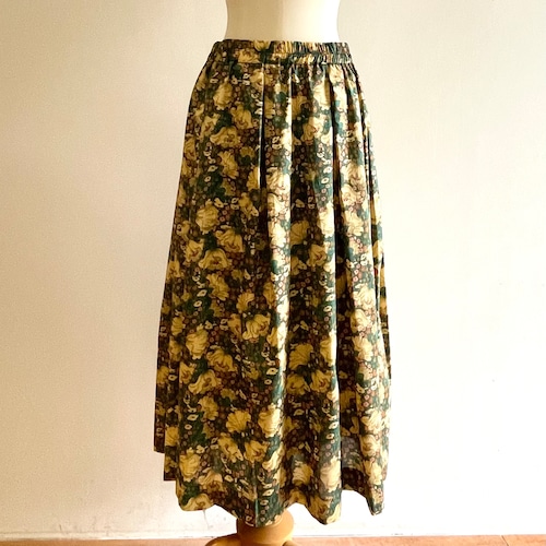 レトロな花柄のリバティプリントを使用し、前後3か所ずつボックスタックを施した立体感のあるドレープがきれいなスカートです。ウエストは総ゴムでリラックス感のある着心地です。