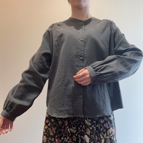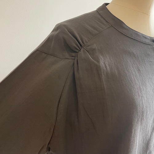 繊細な細番手の糸で織りあげられ、特殊なワッシャー加工で絶妙なふくらみ感とナチュラルな風合を持つダブルガーゼの【スミレ】ブラウスです。二枚のガーゼを一枚の生地に仕立てたダブルガーゼはふんわりソフトで優しい肌触りが特徴で保湿性が高く通気性にも優れています。すっきりコンパクトな襟ぐりにクシュっとした肩の切り替えのギャザーがチャームポイントです。肩は前身頃がラグラン袖のパターンになっていてゆとりがあります。