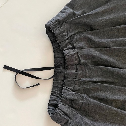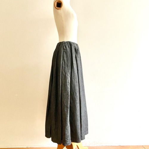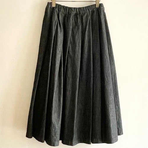 タックから裾に広がるドレープがフェミニンなシルエットでいてウエストが総ゴムのお気楽な着心地でしなやかな質感のブラックデニムのタックスカートです。