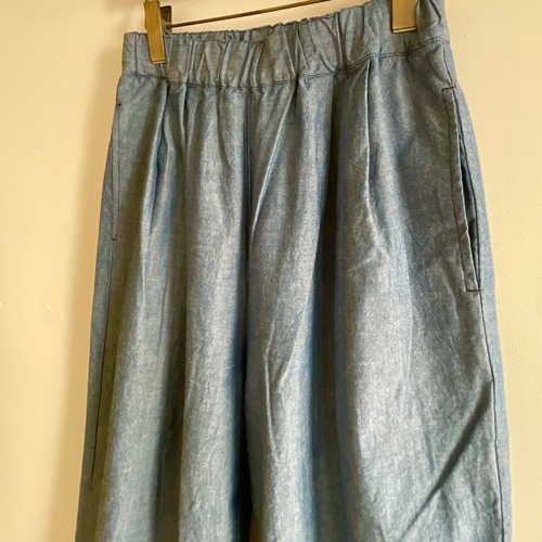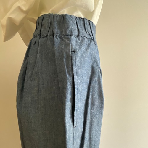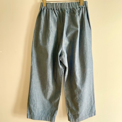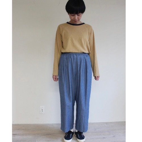 股上深めのほっこりとしたクロップドパンツです。80’s風のダボっとしたパンツをイメージしています。フロントにタックが施され、ウエストは総ゴムで内側の紐で絞る事が出来ます。