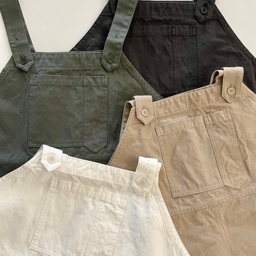 重ね着がしやすいゆったりとした着心地で肩紐のボタンで着丈の長さを調節できます。
