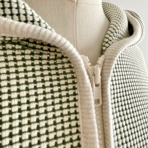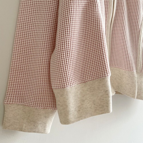 優しい色合いのメランジェ調ワッフル生地を使用したジップアップパーカーです。各色、袖口と裾は優しい杢オートミール色のリブ生地になっています。