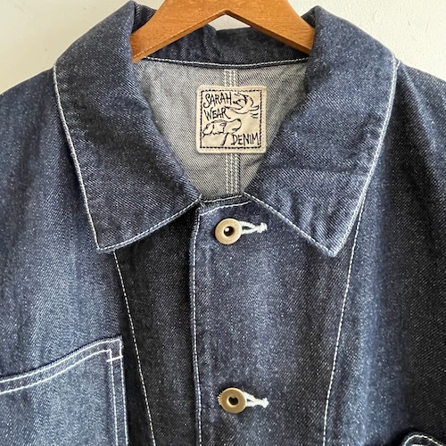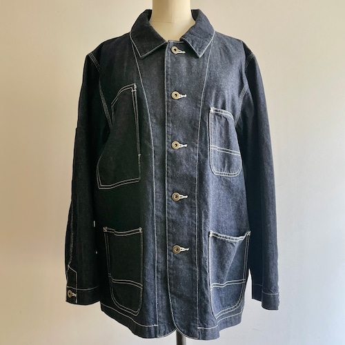 適度な厚みとハリ感でやわらかな着心地のダークなインディゴデニムに白のステッチを効かせたにぎやかなポケット使いのワークジャケットです。ヴィンテージ風なドーナツボタンを使用し、合わせは左上前開きです。