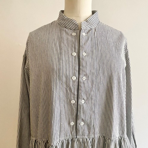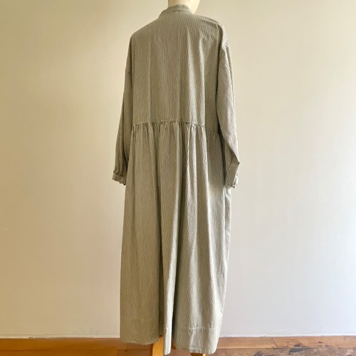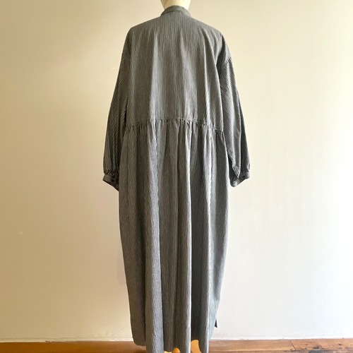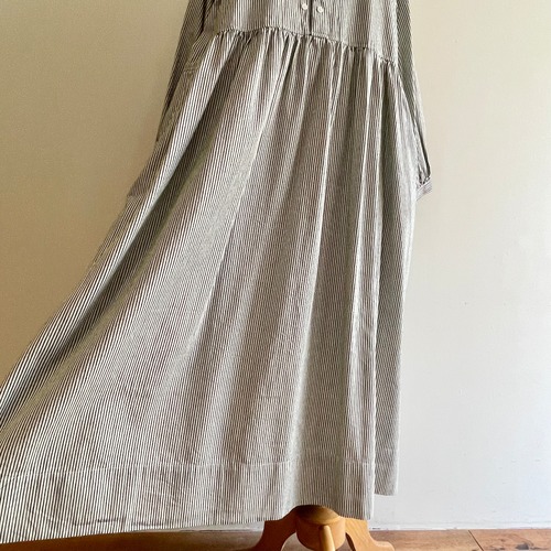 たっぷり分量でウエスト切替に一周ギャザーを施し、袖口もパフになっていてふんわりと素材のなめらかさを最大限に生かしたフォルムのファーマーズドレスです。