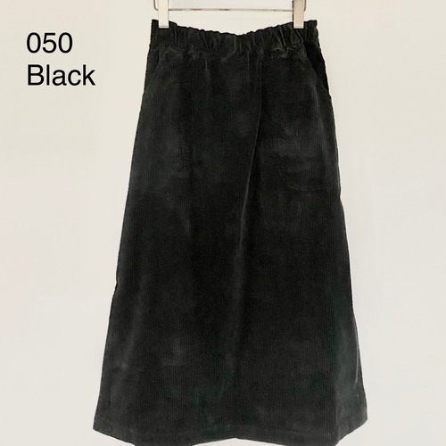 足さばきの良い台形シルエットで前、後ろと右脇にポケットの付いたワークテイストのスカートです。後ろと脇ポケットは生地の向きを変えて畝(うね)が横向きになっています。ゴムのウエストの内側の紐で調節ができます。