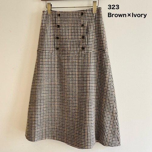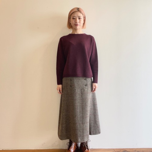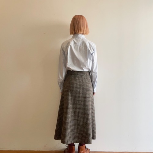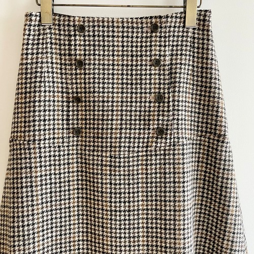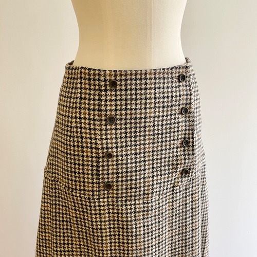 英国MOON社の上質な生地を使用したガンクラブチェックのツイードスカート。ウエストからヒップのカーブがきれいなハイウエストスカートです。サイズによりウエストの位置や丈の長さが変わるのでお好みでサイズを選んでいただけます。レトロなフロントのボタンは片側だけ外れる仕様になっています。