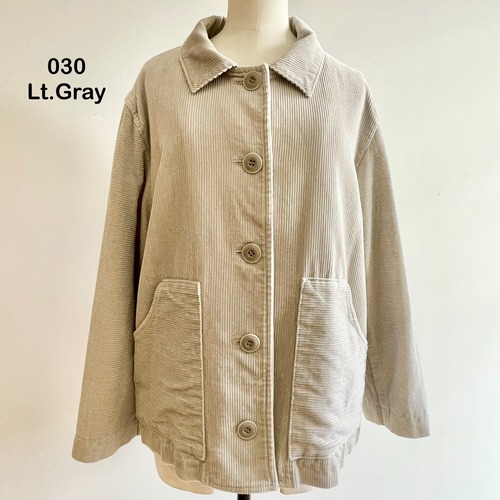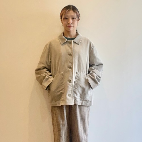 ソフトな肌触りとふんわりとした起毛感の暖かみのある中太畝の8ウェルのコーデュロイを使用しています。丸みのある広めの襟ぐりや、ゆるいボックスシルエットで重ね着がしやすく、内側は表地としても使用しているウール/コットン生地の総裏仕様なので更に保温性があります。