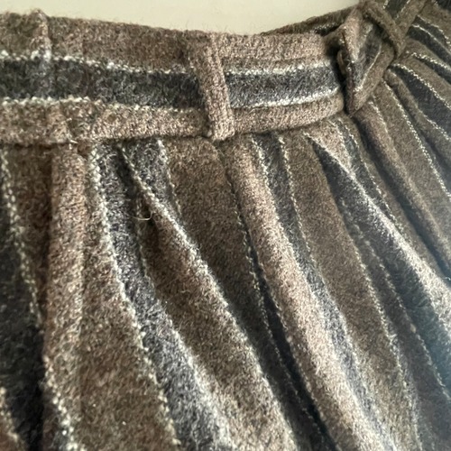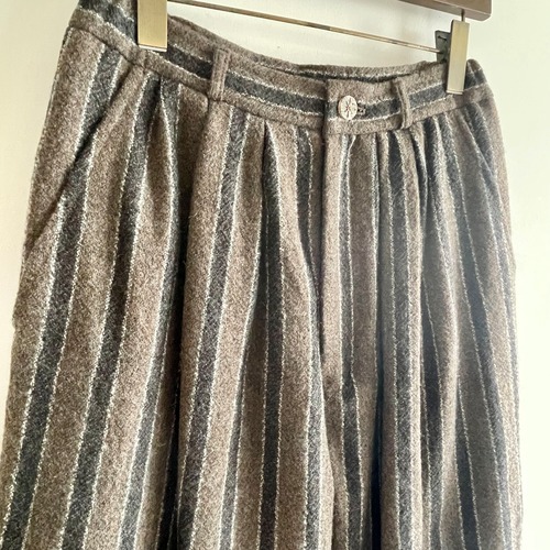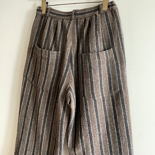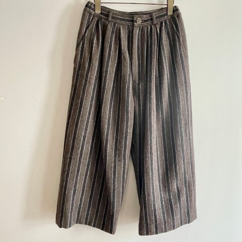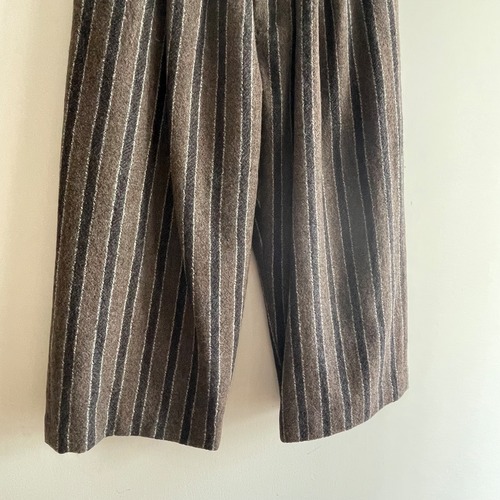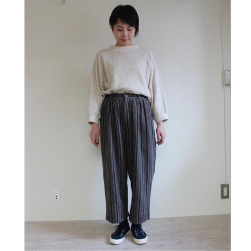 軽くてやわらかな着心地、ヴィンテージ感漂うストライプのクロップドパンツです。ウエスト前後のタックと両脇のゴムにより優しい履き心地で伸縮性のある裏地が付いています。