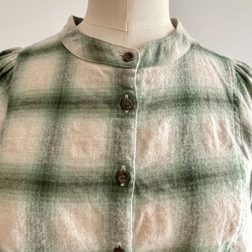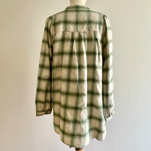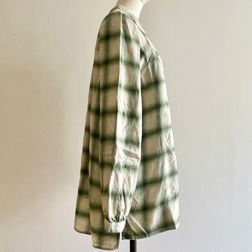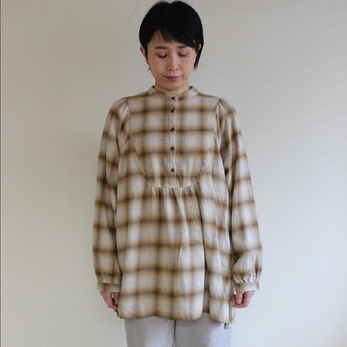やわらかな配色のオンブレチェック(グラデーションにより境目がぼやけて見える格子柄)の被りタイプのブラウス。