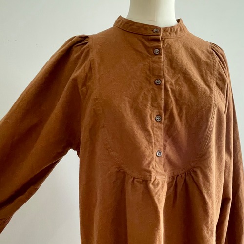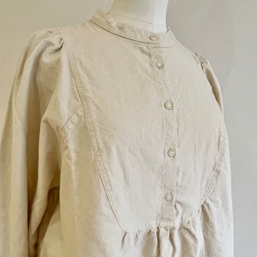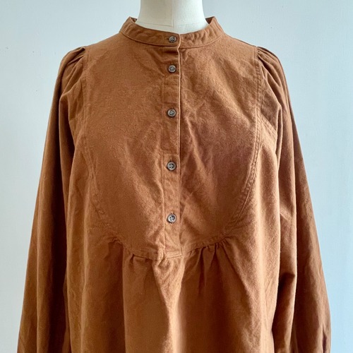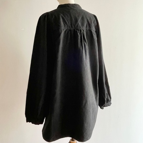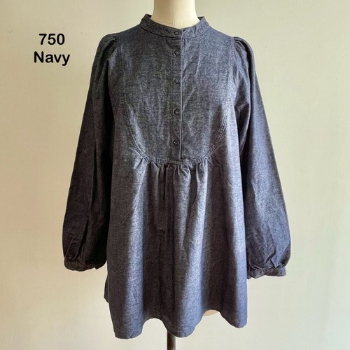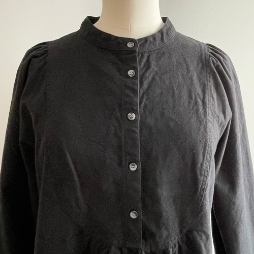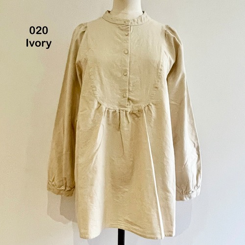 胸の切替の曲線やギャザー使いがロマンティックな雰囲気の被りタイプのブラウスです。コンパクトで少し立ち上がりのある襟元がお顔周りをすっきりと引き締めます。裾は後ろが長く前後差が付いています。