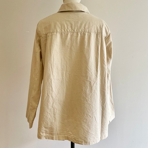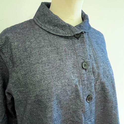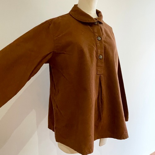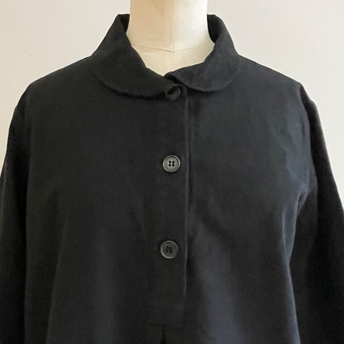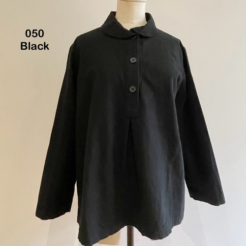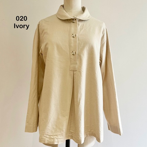 コンパクトな襟ぐりと丸みのあるショールカラーで、お顔周りがすっきりとした印象になるプルオーバータイプのシャツ。身頃は前後差があり裾広がりになっています。