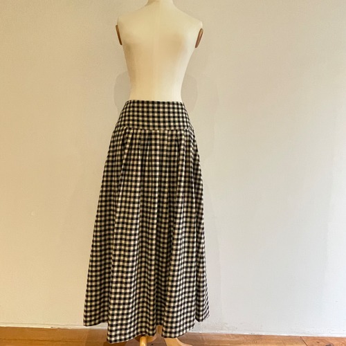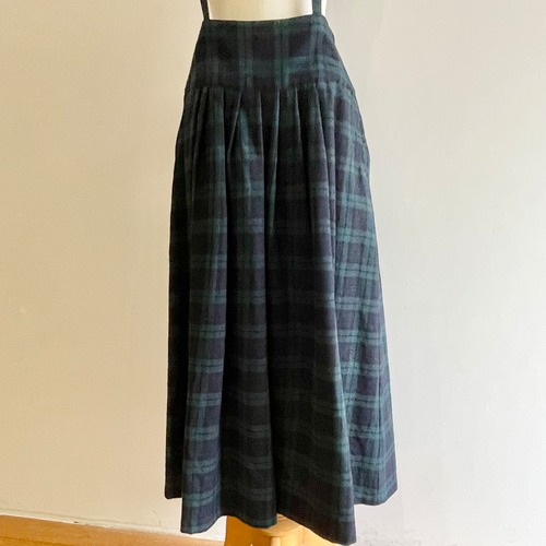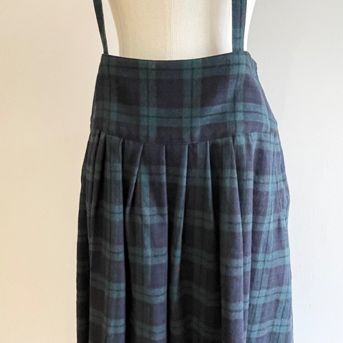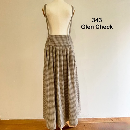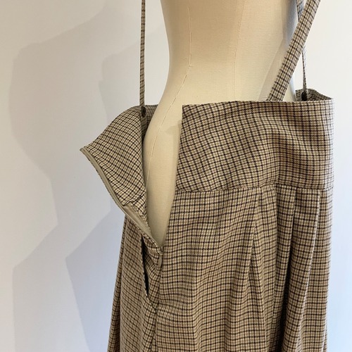 【Olive】と名付けられたサスペンダー付きスカート。サスペンダーは取り外しが可能で、内側のボタンで前後それぞれ2段階に長さを調節できます。ウエスト切替位置に細幅のタックが施され腰回りはすっきりとした印象です。ウールとコットンのワッシャー起毛加工によるふっくらとした風合いと暖かみが特徴です。