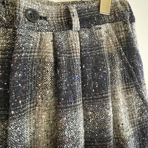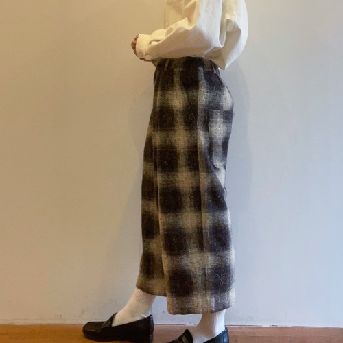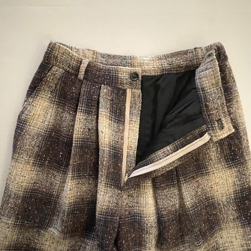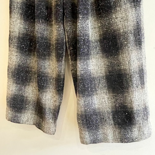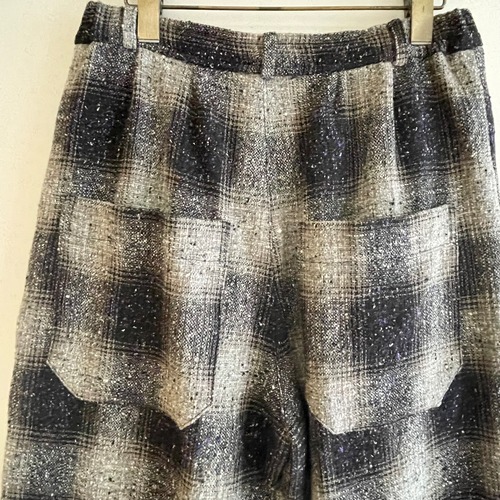 レトロな雰囲気のオンブレチェック(グラデーションにより境目がぼやけて見える格子柄)のツイード生地を使用したクロップドパンツです。ウエスト前後のタックと両脇のゴムにより優しい履き心地で伸縮性のある裏地が付いています。